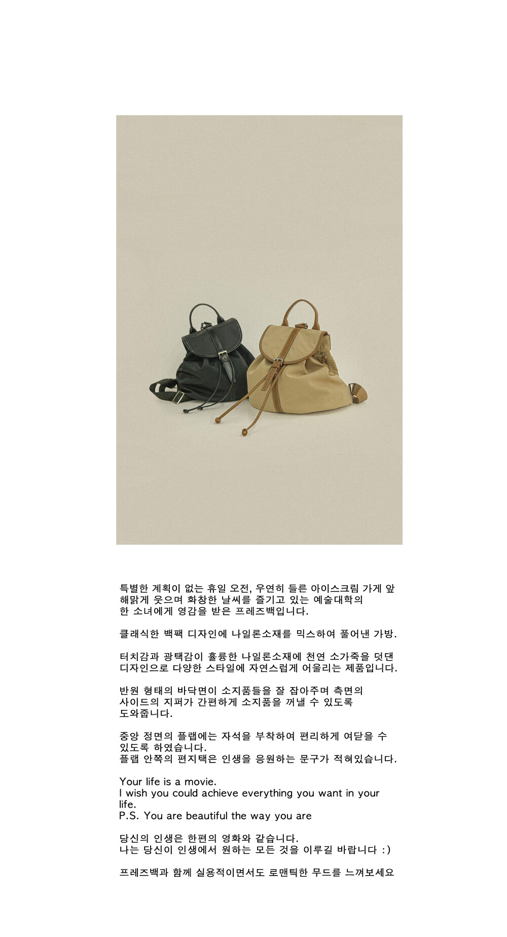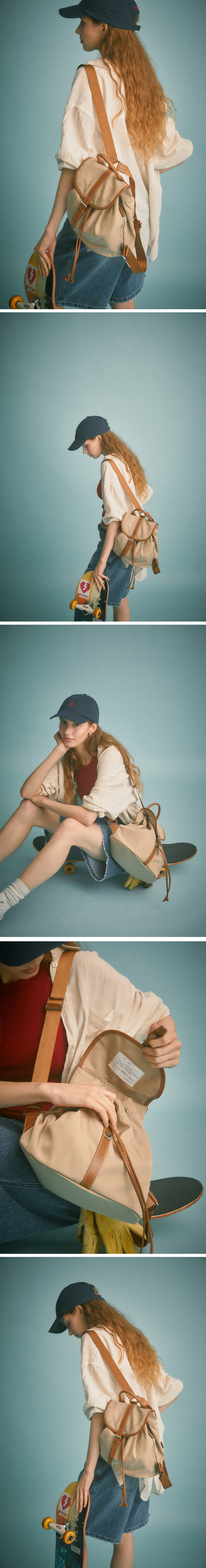 클래식한 백팩 디자인에 나일론소재를 믹스하여 풀어낸 가방.