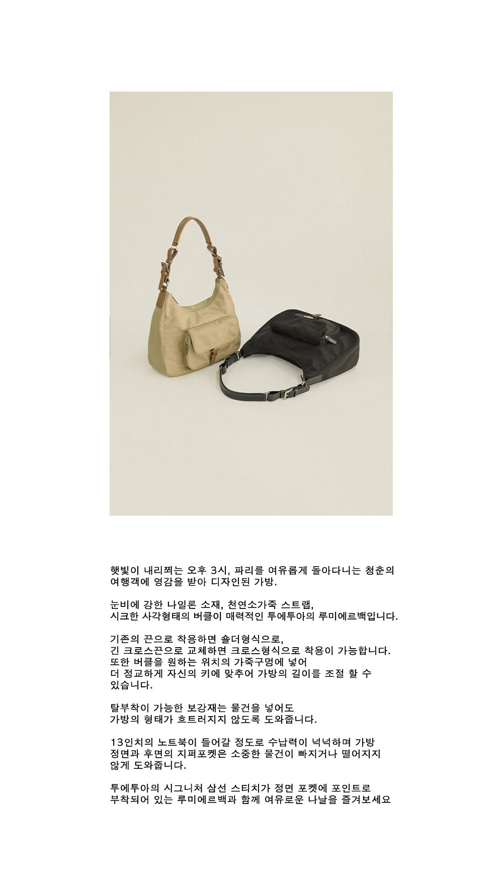 투에투아의 시그니처 삼선 스티치가 정면 포켓에 포인트로 부착되어 있는 루미에르백과 함께 여유로운 나날을 즐겨보세요
