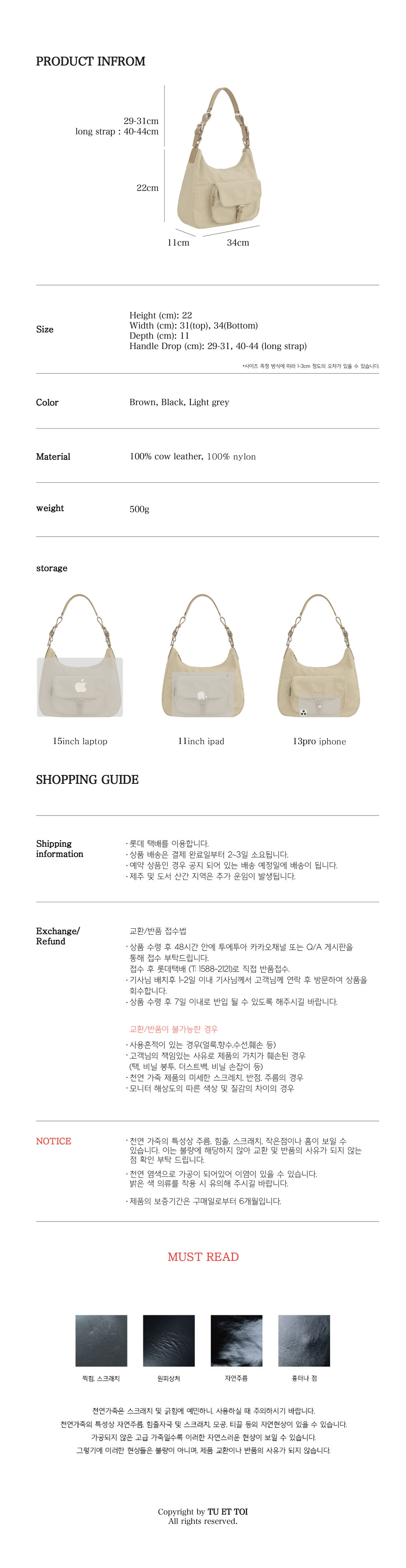 눈비에 강한 나일론 소재, 천연소가죽 스트랩, 시크한 사각형태의 버클이 매력적인 투에투아의 루미에르백입니다.