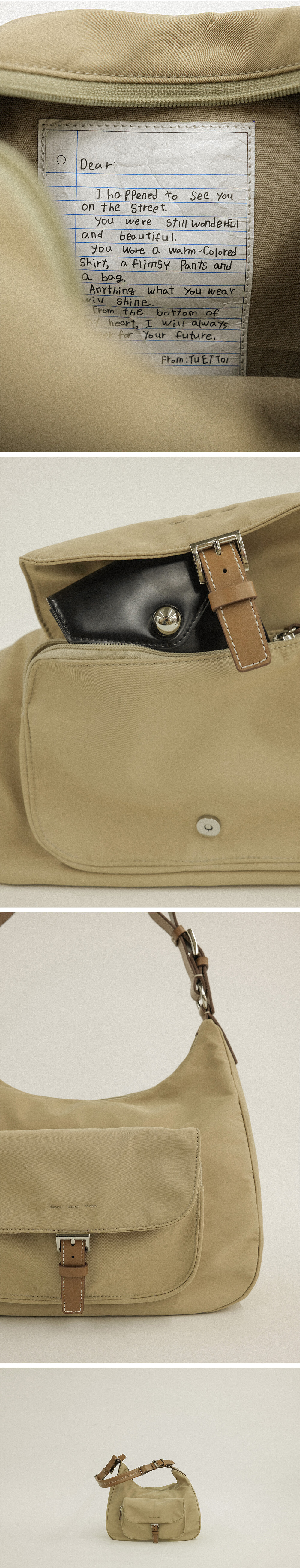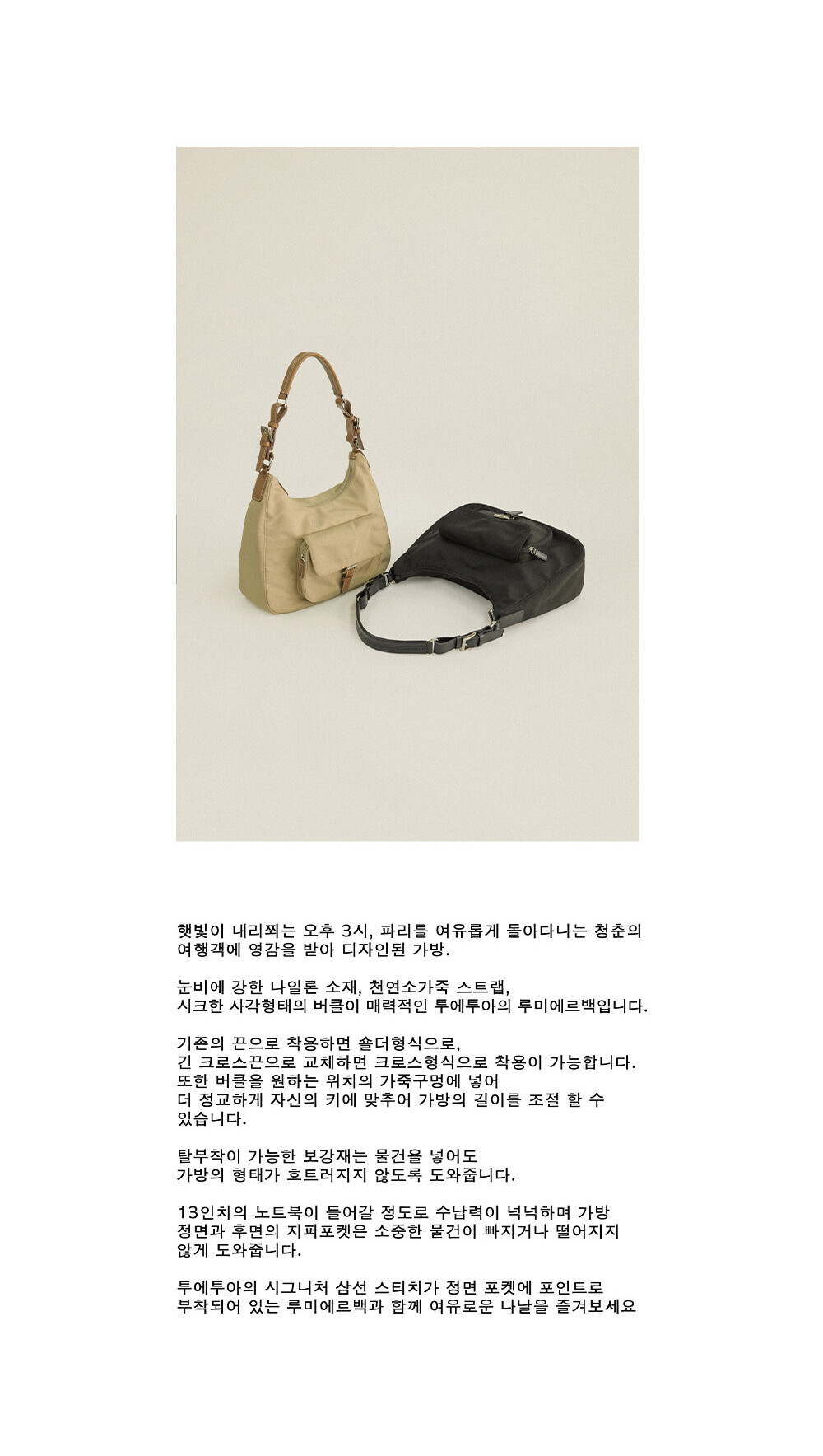 눈비에 강한 나일론 소재, 천연소가죽 스트랩, 시크한 사각형태의 버클이 매력적인 투에투아의 루미에르백입니다.