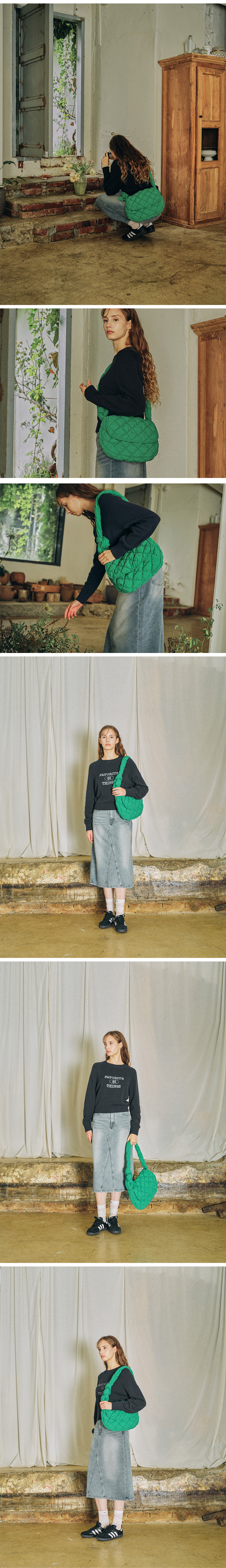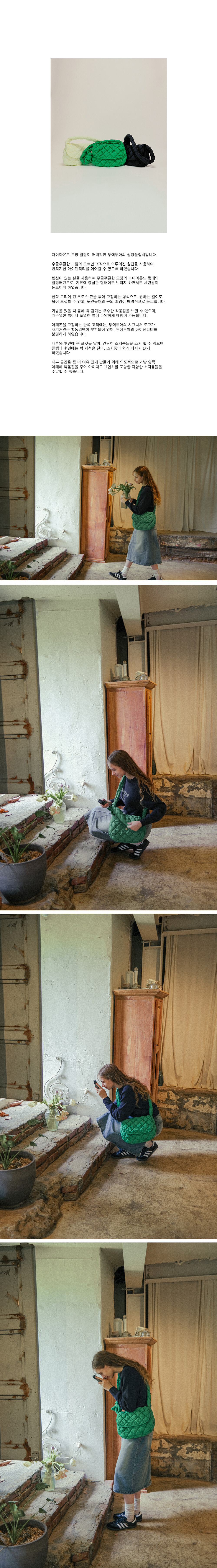 텐션이 있는 실을 사용하여 쭈글쭈글한 모양의 다이아몬드 형태의 퀼팅패턴으로, 기본에 충실한 형태에도 빈티지 하면서도 세련됨이 돋보이게 하였습니다.