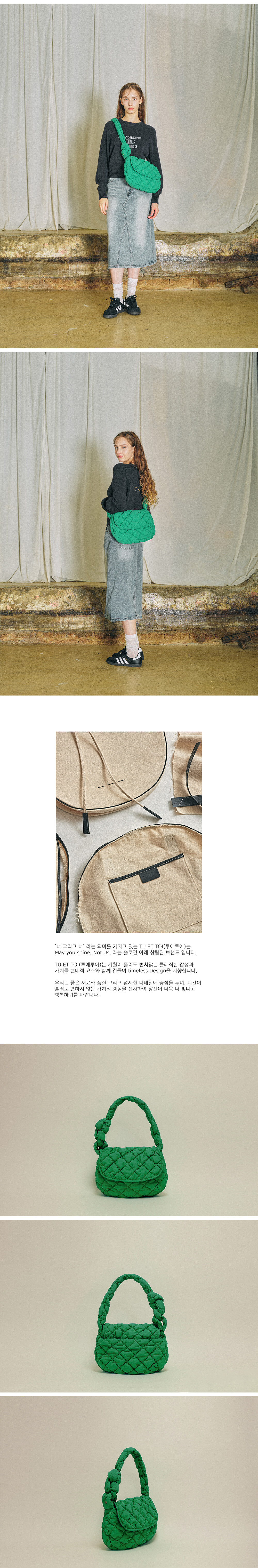 어깨끈을 고정하는 한쪽 고리에는, 투에투아의 시그니처 로고가 새겨져있는 황동리벳이 부착되어 있어, 투에투아의 아이덴티티를 분명하게 하였습니다.