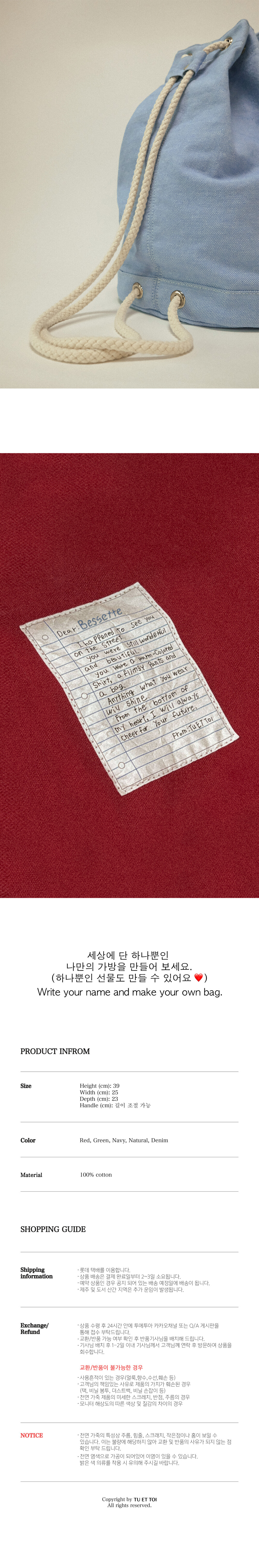 투에투아 캔버스 라인은 데일리 가방인 만큼, 오래 사용할 수 있도록 모든 패턴을 두 겹으로 제작되어 내구성과 완성도를 높였으며, 리버시블이 되어 심플한 느낌의 로고 부분과, 빈티지한 느낌의 편지라벨을 부분을 사용자의 취향에 따라 변형 할수 있도록 하였습니다.