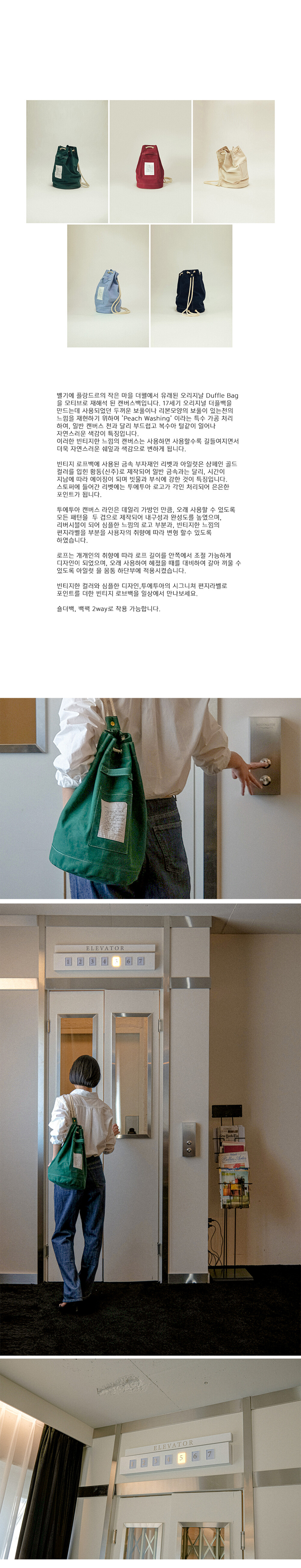 벨기에 플랑드르의 작은 마을 더펠에서 유래된 오리지날 Duffle Bag을 모티브로 재해석 된 캔버스백입니다. 17세기 오리지널 더플백을 만드는데 사용되었던 두꺼운 보풀이나 리본모양의 보풀이 있는천의 느낌을 재현하기 위하여 ‘Peach Washing’ 이라는 특수 가공 처리 하여, 일반 캔버스 천과 달리 부드럽고 복수아 털같이 일어나 자연스러운 색감이 특징입니다.