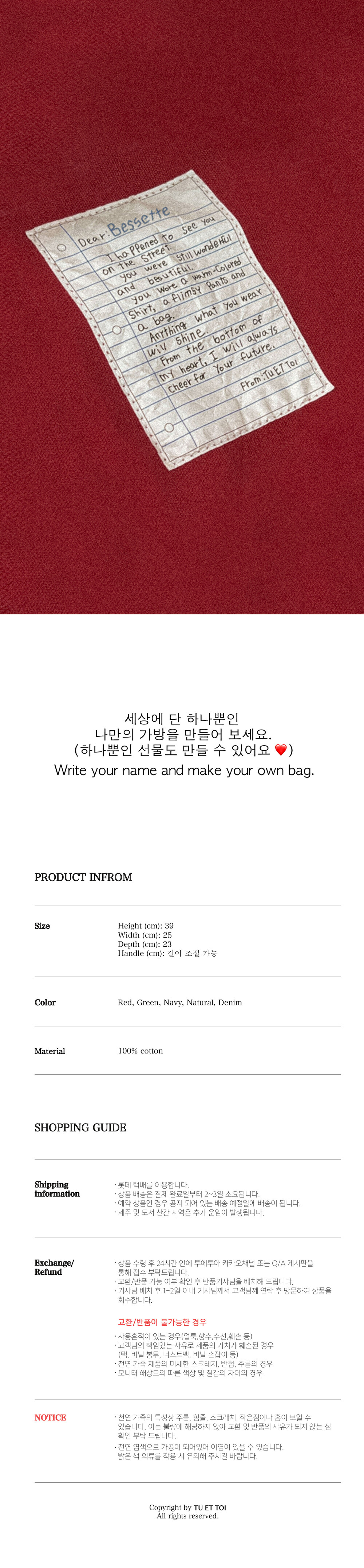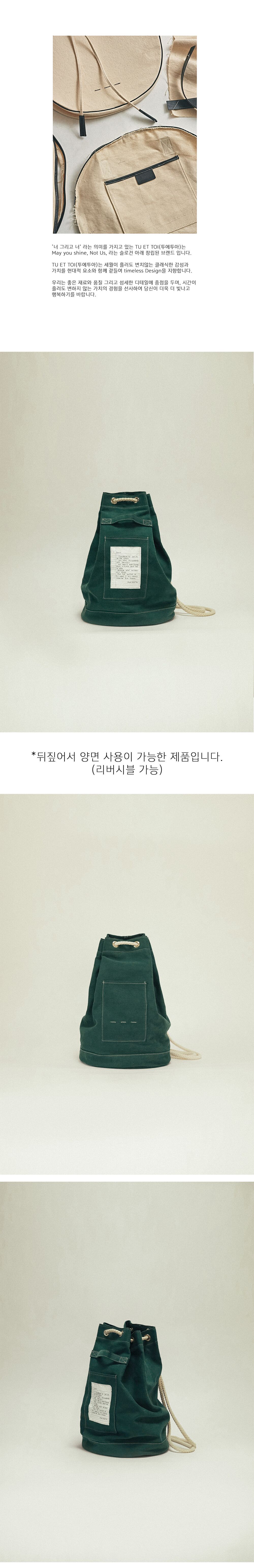 투에투아 캔버스 라인은 데일리 가방인 만큼, 오래 사용할 수 있도록 모든 패턴을 두 겹으로 제작되어 내구성과 완성도를 높였으며, 리버시블이 되어 심플한 느낌의 로고 부분과, 빈티지한 느낌의 편지라벨을 부분을 사용자의 취향에 따라 변형 할수 있도록 하였습니다.