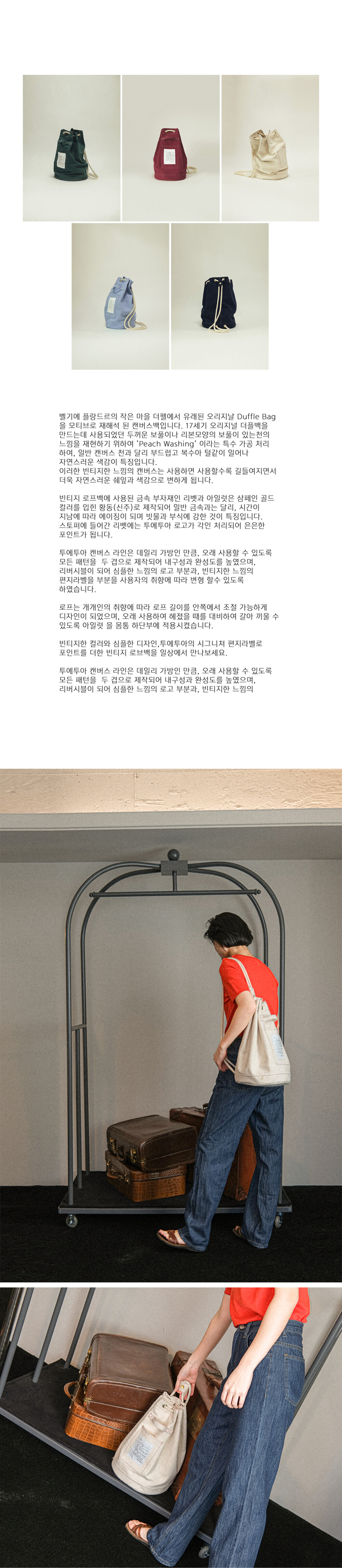 벨기에 플랑드르의 작은 마을 더펠에서 유래된 오리지날 Duffle Bag을 모티브로 재해석 된 캔버스백입니다. 17세기 오리지널 더플백을 만드는데 사용되었던 두꺼운 보풀이나 리본모양의 보풀이 있는천의 느낌을 재현하기 위하여 ‘Peach Washing’ 이라는 특수 가공 처리 하여, 일반 캔버스 천과 달리 부드럽고 복수아 털같이 일어나 자연스러운 색감이 특징입니다.