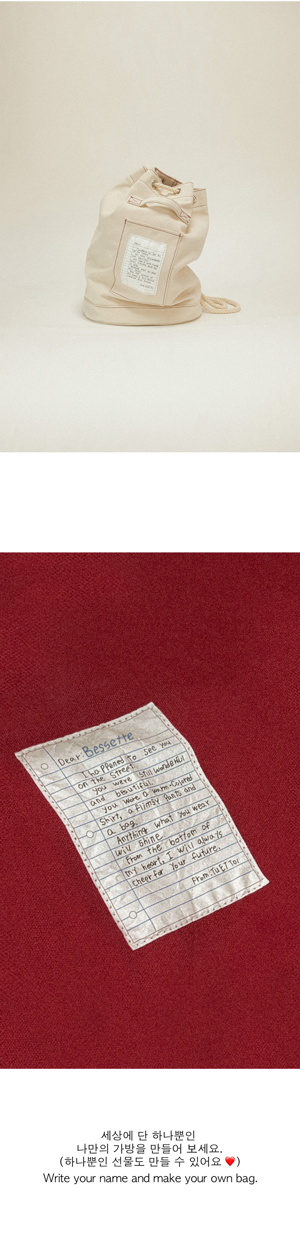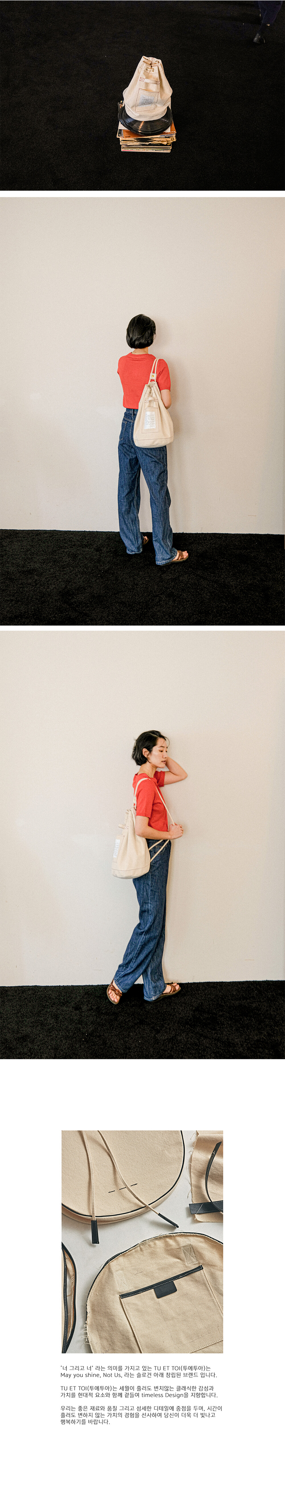 투에투아 캔버스 라인은 데일리 가방인 만큼, 오래 사용할 수 있도록 모든 패턴을 두 겹으로 제작되어 내구성과 완성도를 높였으며, 리버시블이 되어 심플한 느낌의 로고 부분과, 빈티지한 느낌의 편지라벨을 부분을 사용자의 취향에 따라 변형 할수 있도록 하였습니다.