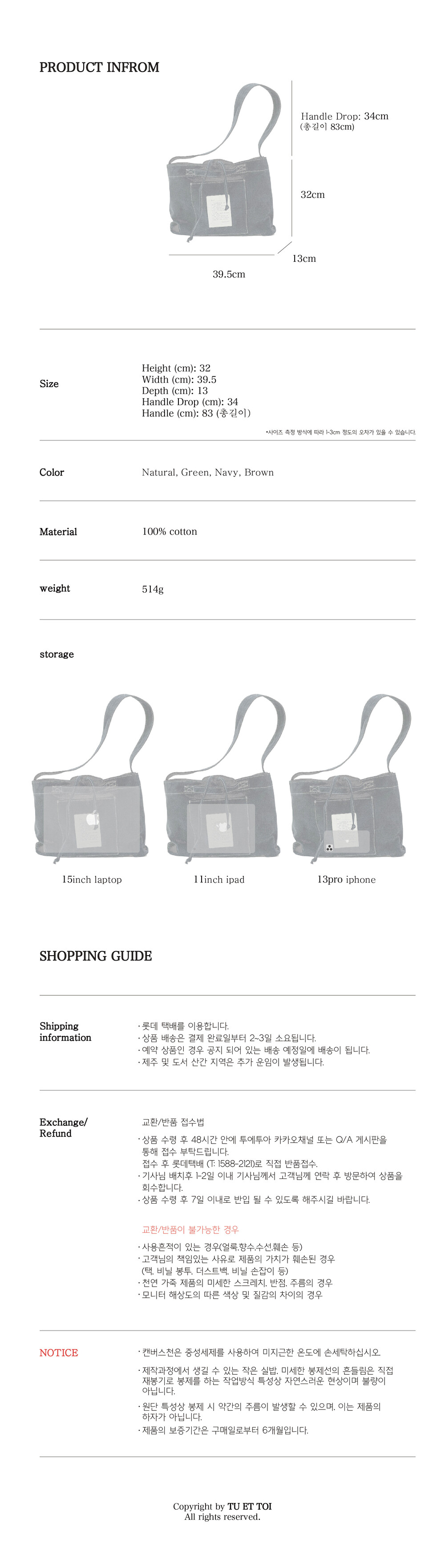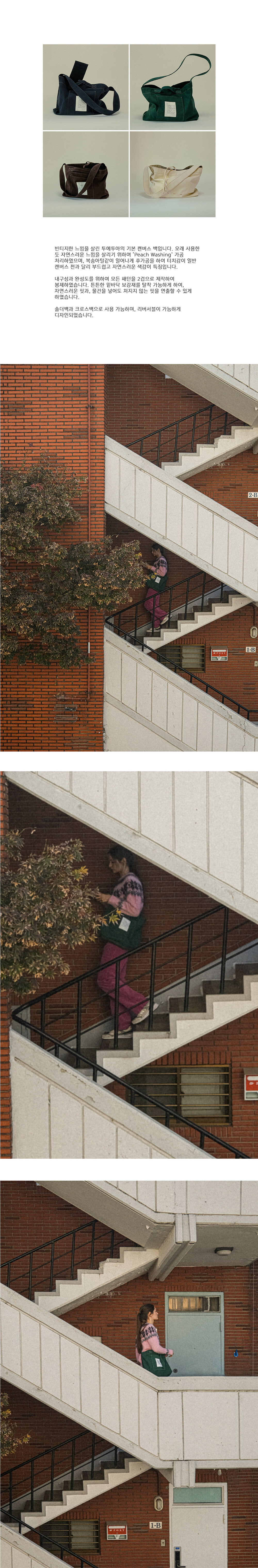 빈티지한 느낌을 살린 투에투아의 기본 캔버스 백입니다. 오래 사용한 듯 자연스러운 느낌을 살리기 위하여 ‘Peach Washing’ 가공 처리하였으며, 복숭아털같이 일어나게 후가공을 하여 터치감이 일반 캔버스 천과 달리 부드럽고 자연스러운 색감이 특징입니다.