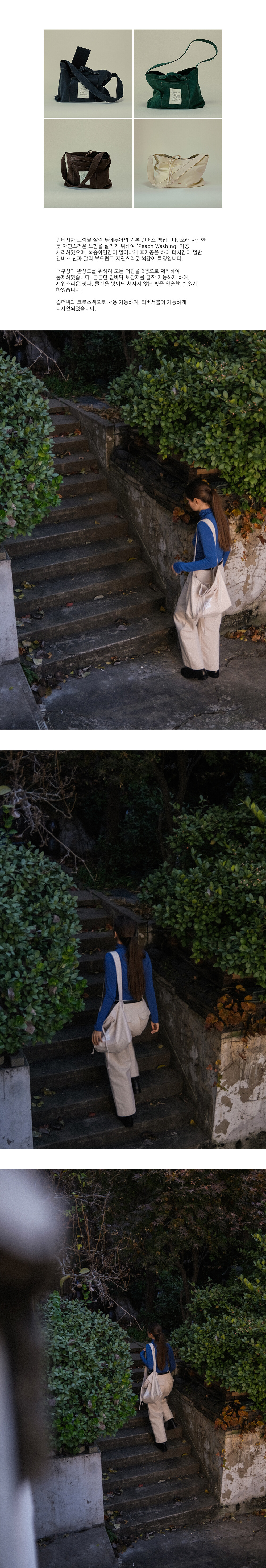 빈티지한 느낌을 살린 투에투아의 기본 캔버스 백입니다. 오래 사용한 듯 자연스러운 느낌을 살리기 위하여 ‘Peach Washing’ 가공 처리하였으며, 복숭아털같이 일어나게 후가공을 하여 터치감이 일반 캔버스 천과 달리 부드럽고 자연스러운 색감이 특징입니다.