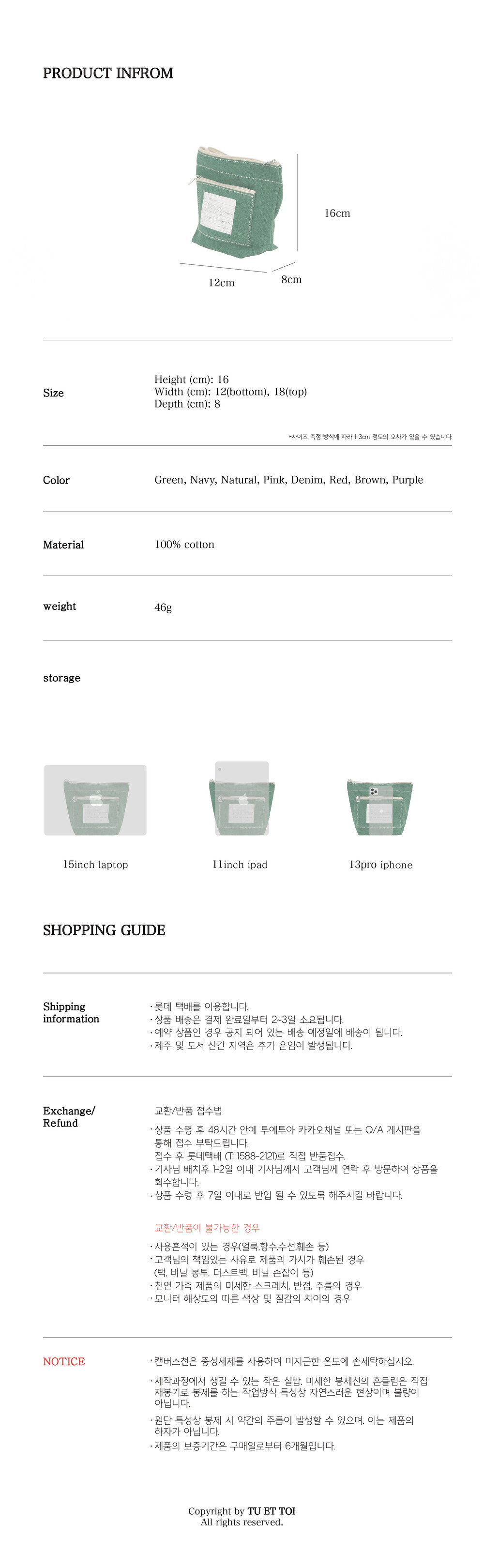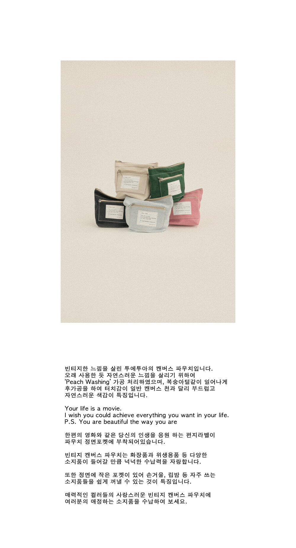 빈티지한 느낌을 살린 투에투아의 캔버스 파우치입니다.오래 사용한 듯 자연스러운 느낌을 살리기 위하여 ‘Peach Washing’ 가공 처리하였으며, 복숭아털같이 일어나게 후가공을 하여 터치감이 일반 캔버스 천과 달리 부드럽고 자연스러운 색감이 특징입니다.